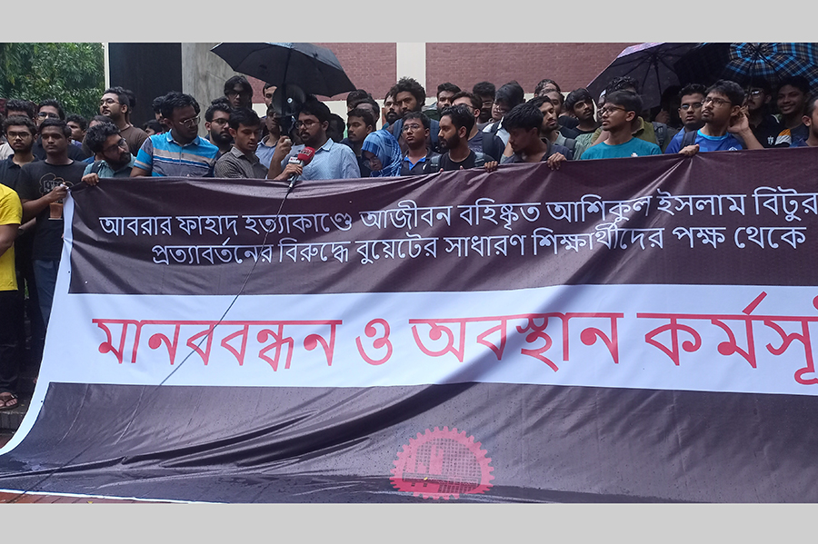 The students of Bangladesh University of Engineering and Technology (BUET) on Monday formed a human chain as one of the accused in the Abrar Fahad murder case attended a class on Sunday (August 6).