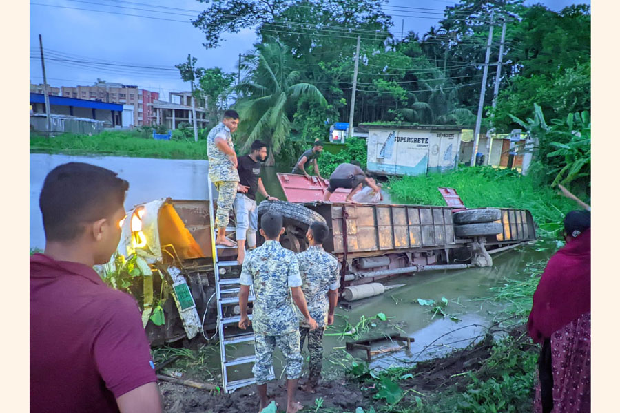 The incident occurred around 5:30 am in front of the APBn office 7 in the Lalabazar area on the Dhaka-Sylhet highway. The Sylhet-bound bus from Dhaka lost control and fell into a pond, according to ASI Mohammad Pabel, media officer of APBn-7, reports UNB.