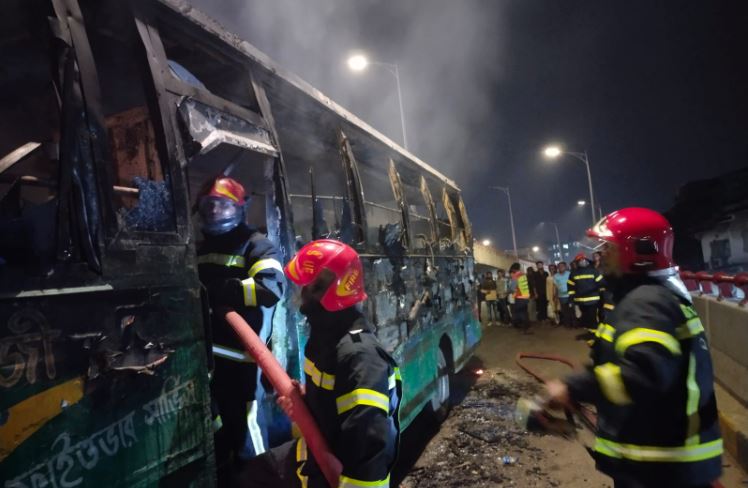 The attack on the “Komol Parinbahan” bus in front of Gulistan Toll Plaza was reported around 7:48 pm on Saturday, confirmed Talha Bin Zashim, station officer of the Fire Service and Civil Defence (media cell).