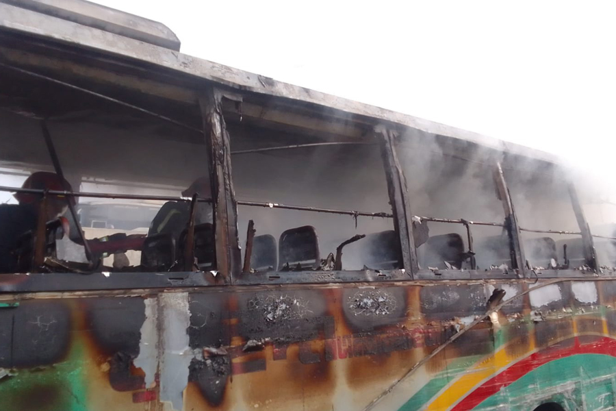 Miscreants set a bus on fire at Postogola in Jurain, Dhaka city, on Sunday during the blockade enforced by the BNP and like-minded parties.