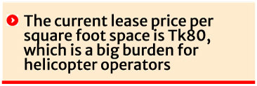 The current rate of leasing per square foot space is Tk80, an amount that is a big burden for the helicopter operators of the country.