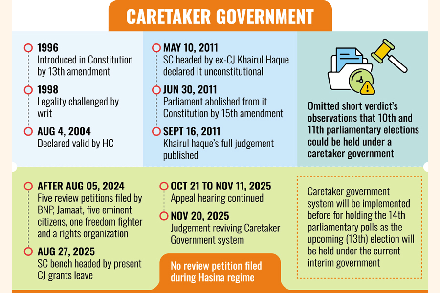 Later, an appeal was filed against the verdict and the Appellate Division headed by then Chief Justice Khairul Haque delivered the verdict on May 10, 2011, scrapping the caretaker system on a majority view.