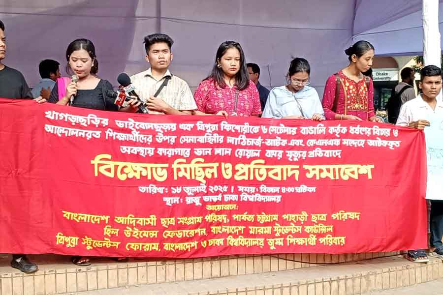 Bangladesh Adivasi Chhatra Sangram Parishad, Dhaka University Jumma Students’ Family, Parbatya Chattogram Pahari Chhatra Parishad, Hill Women’s Federation, Bangladesh Marma Students’ Council, and Tripura Students’ Forum were part of the protest programme.