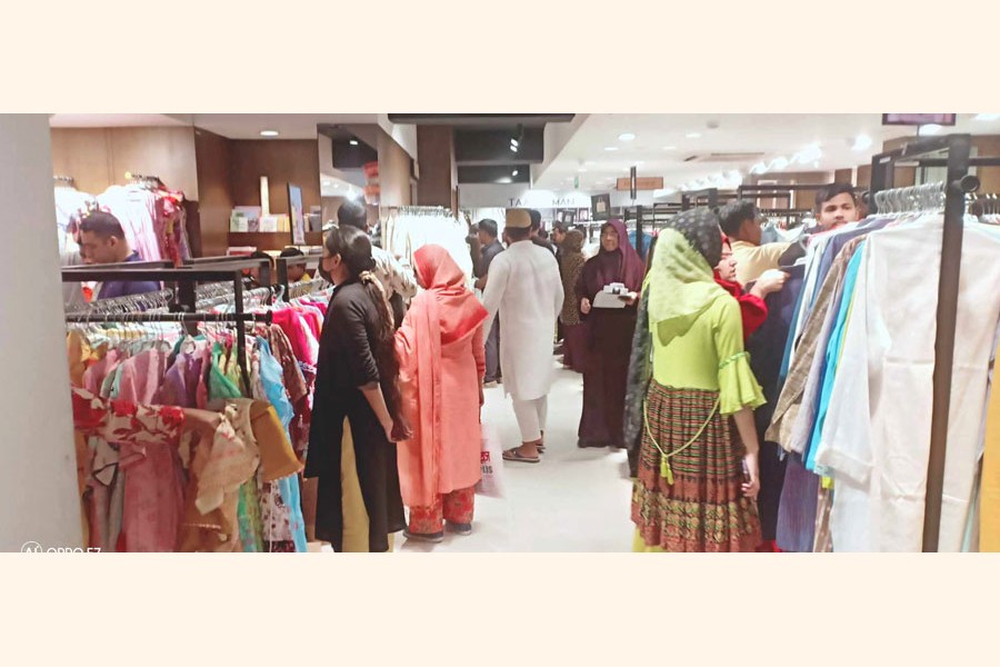 Our correspondent from Bogura writes, shopping ahead of Eid-ul-Fitr has gathered pace in the city markets although traders expect overall sales to fall about 11 per cent from a year earlier due to high inflation eroding consumers' purchasing power.