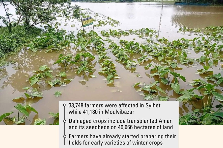 Of the total, 33,748 farmers were affected in Sylhet where crops worth Tk 480 million (48 crore) were damaged, 41,180 over affected in Moulvibazar where crops worth Tk 2.05 billion were damaged.