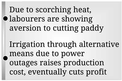 Small rivers, canals, ponds and other waterbodies of the region dried up, hindering the irrigation process, hampering paddy production at a regular cost. Moreover, frequent power outages worsened the situation, making the farmers apprehensive of an additional production cost and less profit.