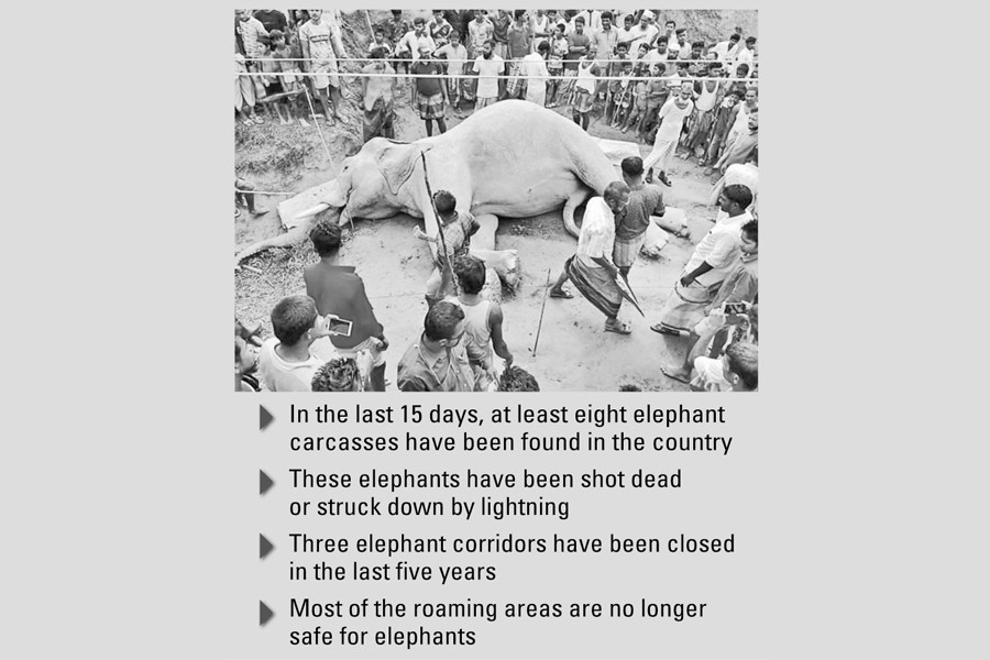 In the last 15 days, at least eight elephant carcasses have been found in different parts of the country. These elephants have been shot dead or trampled by lightning in Chittagong's Satkania and Banshkhali, Sherpur's Sreevardi, Cox's Bazar's Chakoria Harbang and Islamabad under Eidgaon Upazila.