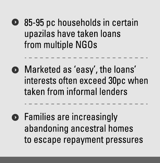 According to field reports, 85-95 per cent of rural households in certain upazilas have taken loans from multiple NGOs.