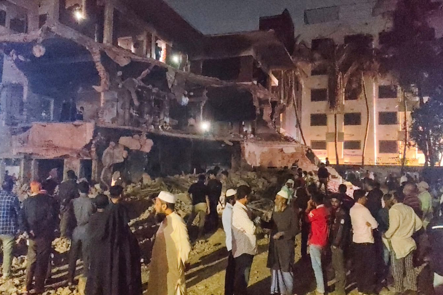 The storied residence overlooking a bend of the Dhanmandi Lake, an epicentre of the country's independence movement, began to collapse under bulldozer impact late Wednesday night, following a fire set on its third floor earlier that evening.