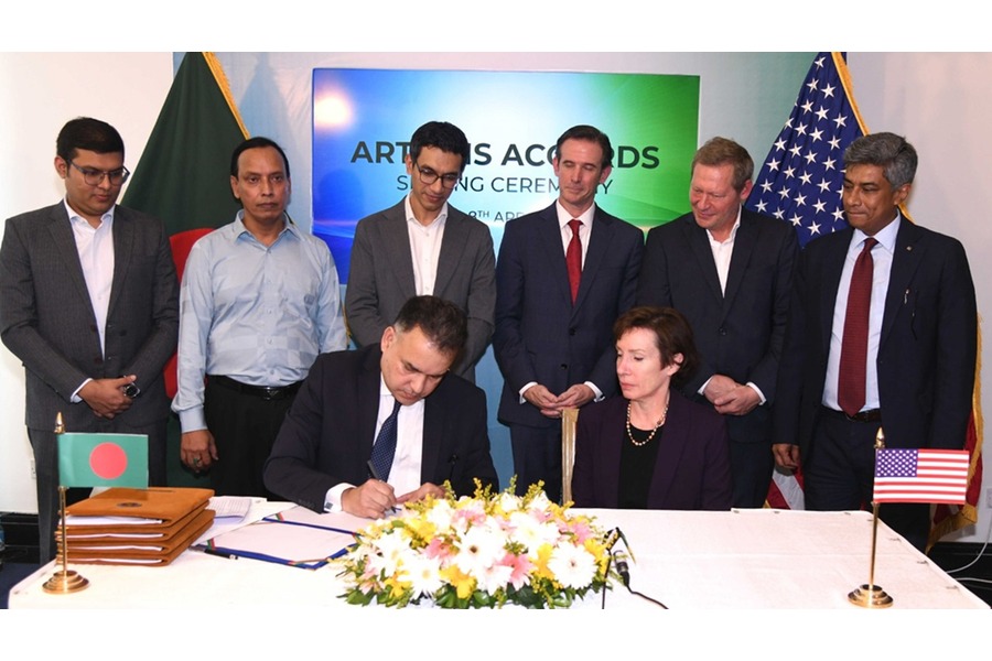 Chargé d'Affaires of the US Embassy in Dhaka Trucey Ann Jacobson and Bangladesh Defence Secretary Md Ashraf Uddin inked the space-cooperation instrument at a ceremony held in a Dhaka hotel on the sidelines of the ongoing investment summit.