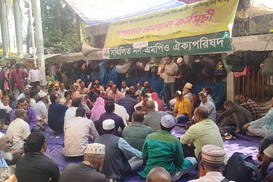 The sit-in is ongoing under the banner of an organisation called the “Non-MPO Educational Institutions’ Unity Council”, demanding that non-MPO educational institutions be listed for government pay and allowances, or MPO inclusion.