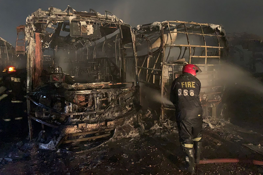 A fire that broke out in 14 Volvo buses of London Express Paribahan, parked in a garage in Dhaka's Demra on Monday evening, was brought under control.
