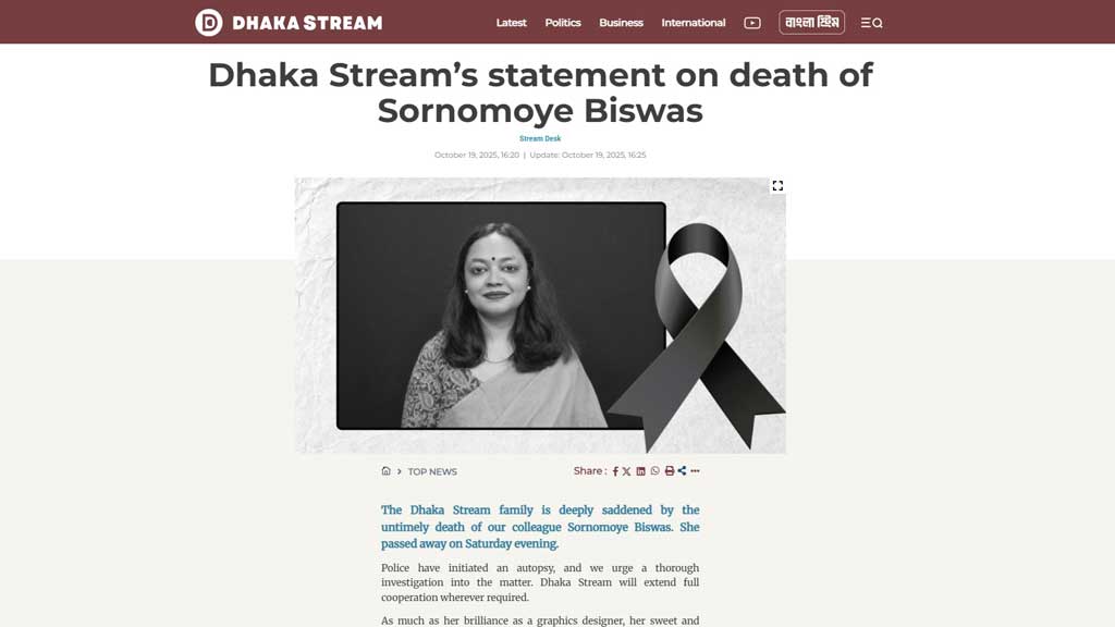 Dhaka Stream broke the news around 3:15am, saying Swarnamoyee joined as a trainee graphic designer earlier this year after graduating from Home Economics College. Dhaka Stream Editor-in-Chief Golam Iftekhar Mahmud expressed deep condolences.