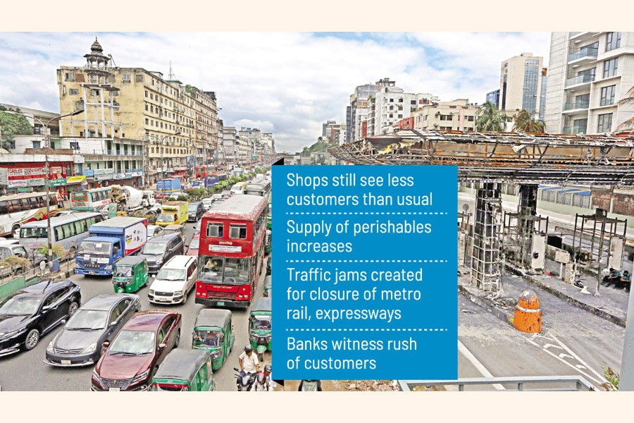 He said the prices of all vegetables declined by Tk 10 a kg. However, banks witnessed utmost crowds as people thronged for cash withdrawal and other business activities.