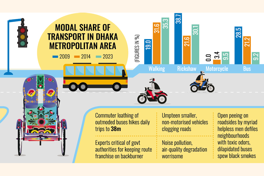 The latest household survey discloses a drastic drop in shares of buses from the bloated total trips during the period, as experts blame the unwelcome transition in public-transport system in the crammed megacity on government authorities keeping a route-franchise project for the run of modern buses on the backburner for years.