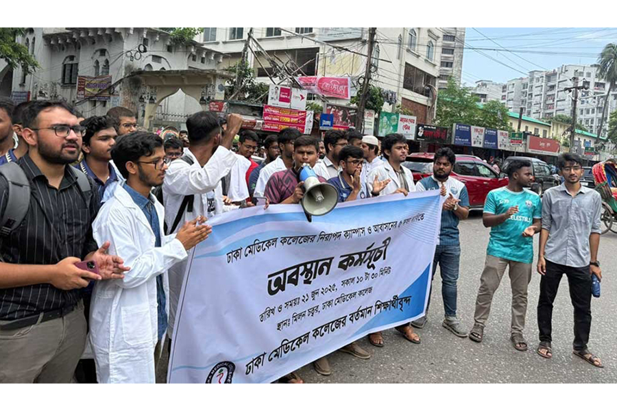 Students demonstrated at Dhaka Medical College on Saturday morning as part of movement pushing for a five-point list of demands, including safe campus and accommodation.