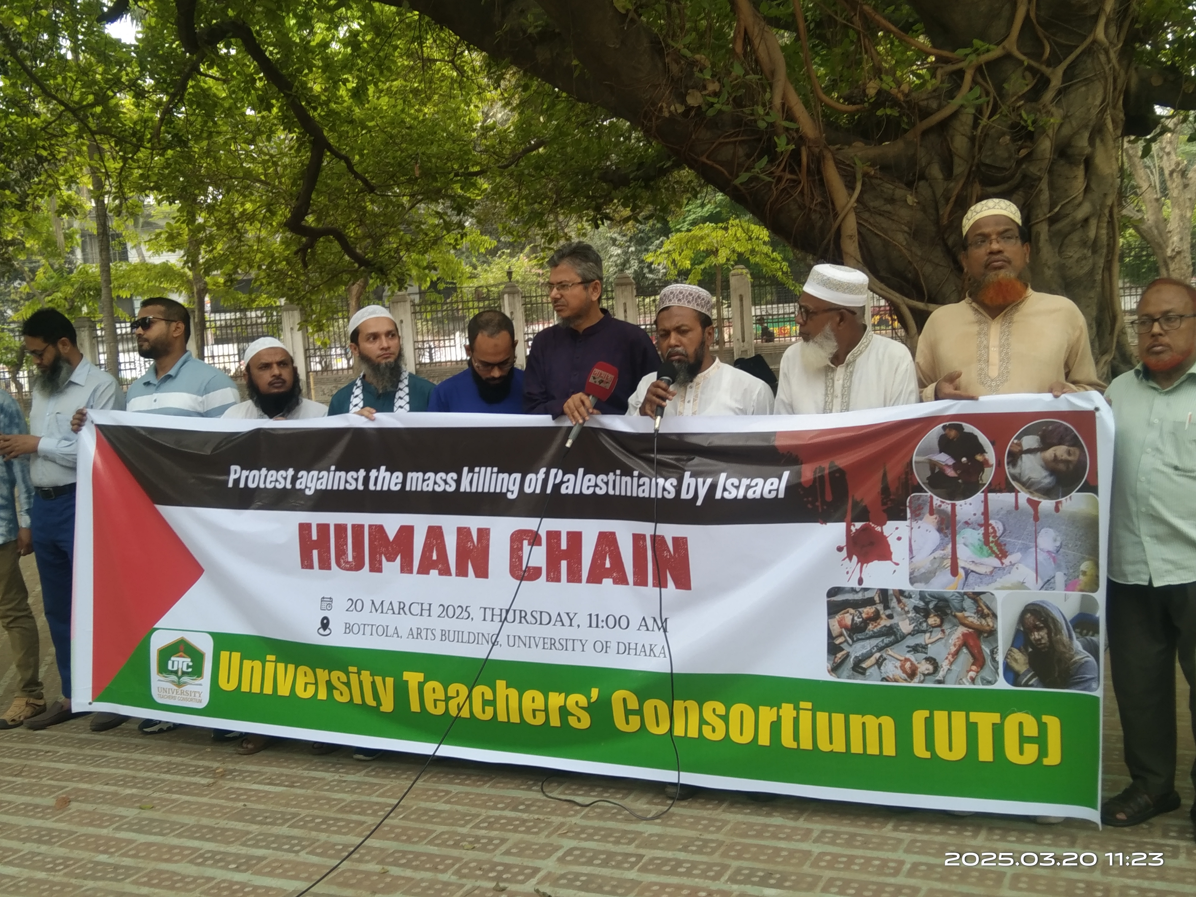 A group of Dhaka University teachers formed a human chain at the university’s Battola on Thursday, protesting mass killings of Palestinians by Israel.