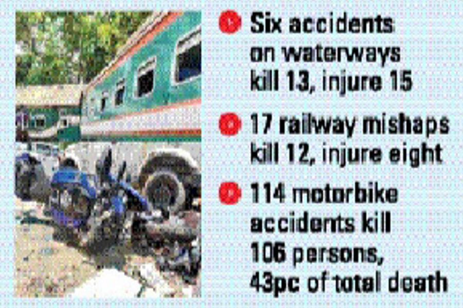Besides, six accidents on waterways killed 13 people and injured 15, while 17 railway-related mishaps killed 12 people and wounded eight.