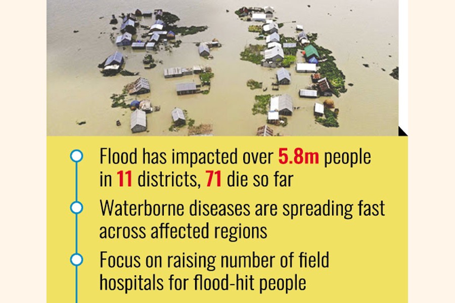 Waterborne diseases like diarrhea, skin diseases, and soft tissue infections, as well as diseases caused by rats and mosquitoes, have started spreading as 90 per cent of people in Feni, Noakhali, and Comilla were affected by the floodwaters, said experts monitoring the unprecedented flood that devastated the region.