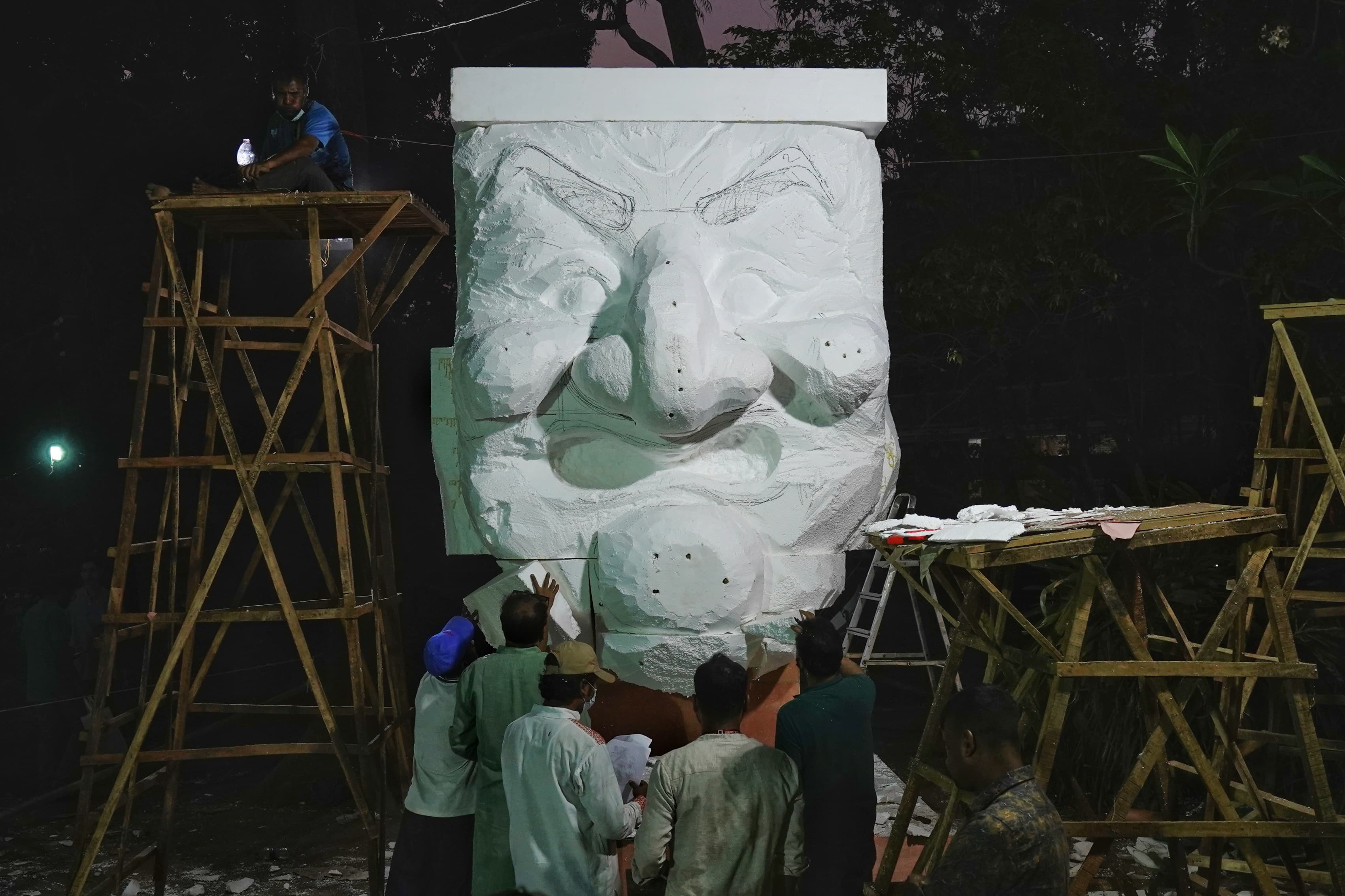 But the artists have taken on the challenge of recreating the piece overnight at the advice of Dhaka University authorities, using makeshift materials such as corrugated sheets to meet the urgent timeline.