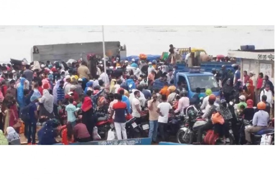 Travellers have crammed into ferries at Munshiganj’s Shimulia to cross the Padma river to 21 southern districts despite coronavirus scare with around 10 days left to Eid-ul-Fitr.