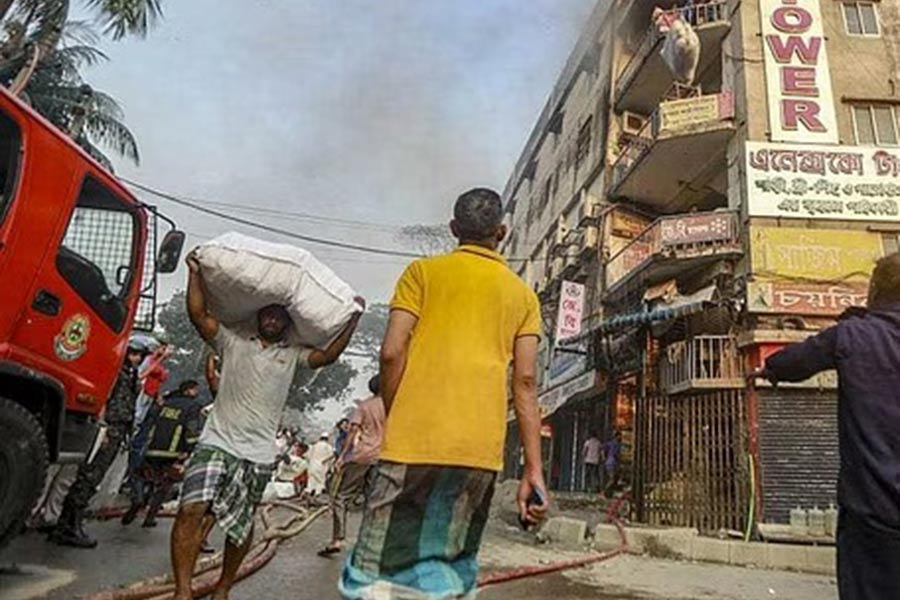Fire service personnel are still deployed at Bangabazar, one of the biggest markets for cheaper clothes, to put out the flames, 24 hours after a devastating fire gutted hundreds of shops.
