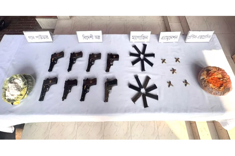 They recovered eight foreign-made pistols, 16 magazines, 26 rounds of bullets, 2.39 kg of gunpowder, and 2.23 kg of plastic explosives, according to a media release from the Inter Services Public Relations (ISPR).