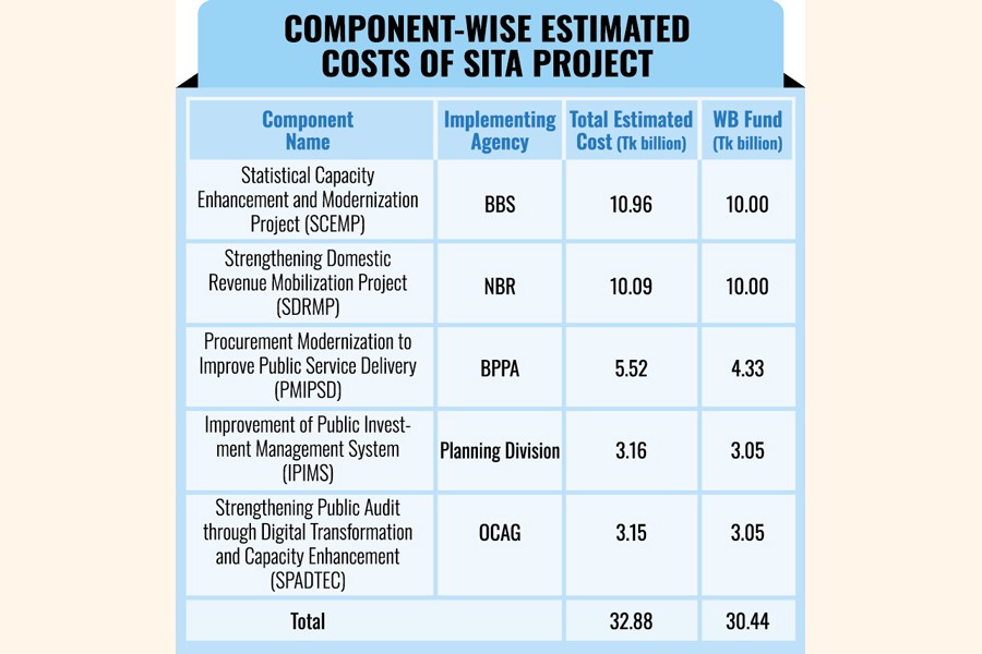 Sources said the aggregate cost of the five projects under SITA stands at around Tk 32.88 billion, of which the World Bank is to provide Tk 30.45 billion while only 7.42 per cent of the total cost has to be available from the government exchequer, official documents revealed.