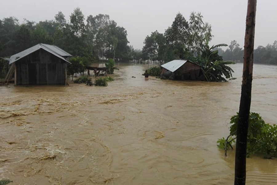 Sherpur's relief office said 172 villages in 35 unions of five upazilas had been flooded after heavy rains in the country and upstream regions adjacent to Bangladesh, leaving at least 63,000 people stranded.