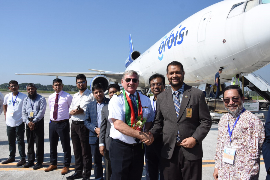 Dr Munir Ahmed, Country Director of Orbis International, Group Captain Shaikh Abdullah Alamgir, Director of Shah Amanat International Airport, and Prof Dr Munirujzaman Osmani from Chittagong Eye Infirmary and Training Complex (CEITC) welcomed the crew at the airport.