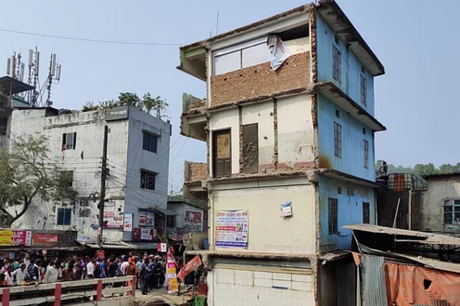 A four-storey building tilted in Raufabad area of Baizid Bostami in Chattogram city on Saturday.