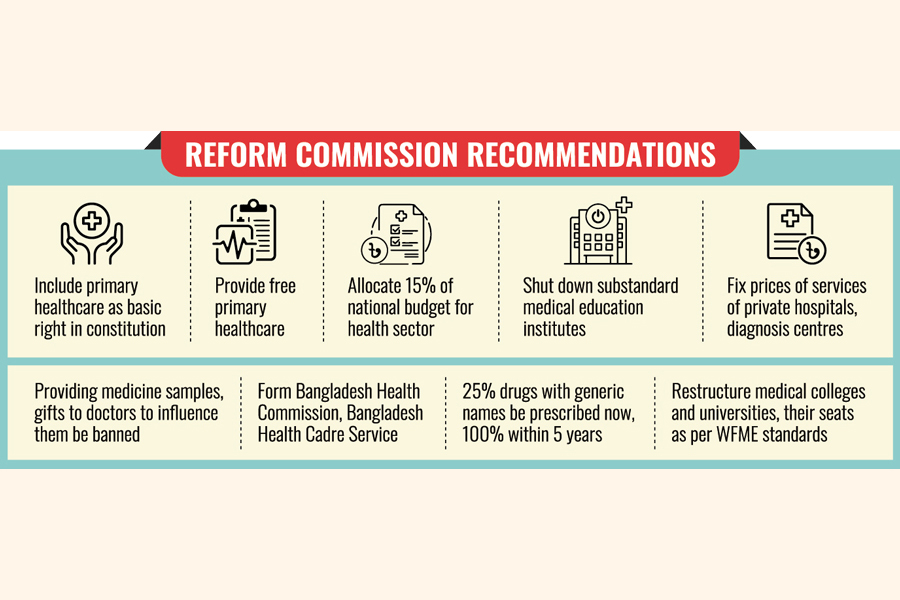 Free primary healthcare and subsidized higher treatments and establishing referral hospitals are among the must-haves prescribed by a reform commission for upgrading the medical sector in Bangladesh that counts huge costs of foreign treatments.