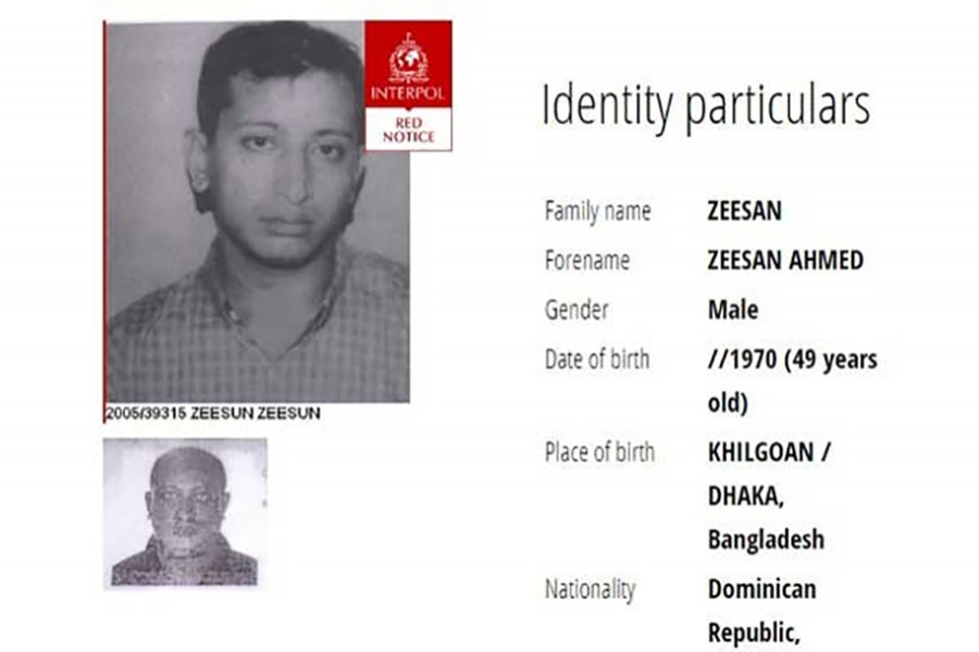 Zeesan, who is on the Interpol's red notice list, was apprehended by police in Dubai four days ago but his identity was confirmed on Wednesday, said Mohiul Islam, the assistant inspector general (national central bureau) of the police headquarters.