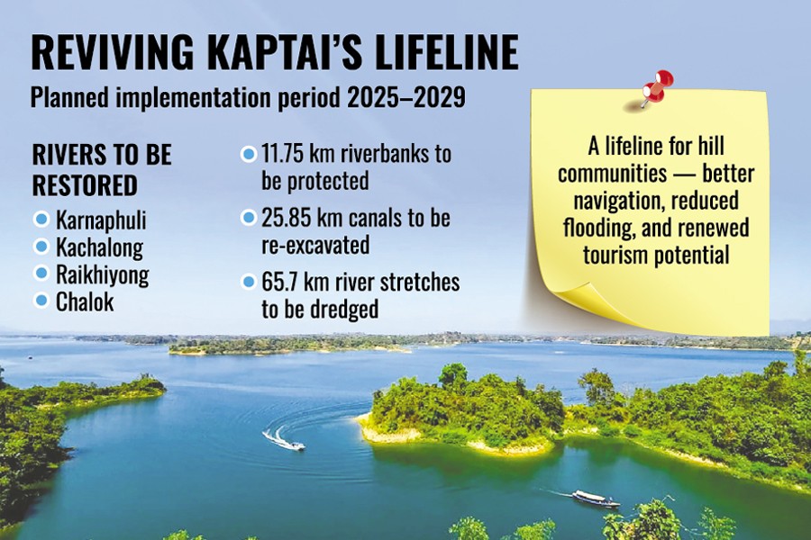The government is set to undertake a Tk 6.89-billion project to restore navigability in Kaptai Lake and four surrounding rivers in the Chattogram Hill Tracts, aiming to prevent flash floods and improve river transport in the region, officials said on Thursday.