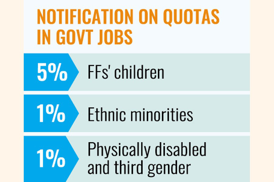The aggregate 7.0 per cent breaks down as 5.0 per cent for children of Freedom Fighters and Birongona, 1.0 per cent for the ethnic minorities and another 1.0 per cent for the physically challenged-and third-gender persons.