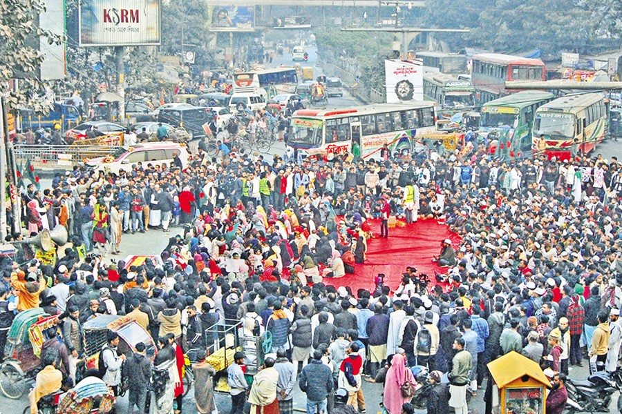 Following Jum'ah prayers, leaders and activists of the platform brought out a protest march from the Dhaka University Central Mosque, demanding justice for Hadi's murder. The procession passed through the university's Central Library and Raju Sculpture before ending at Shahbag.