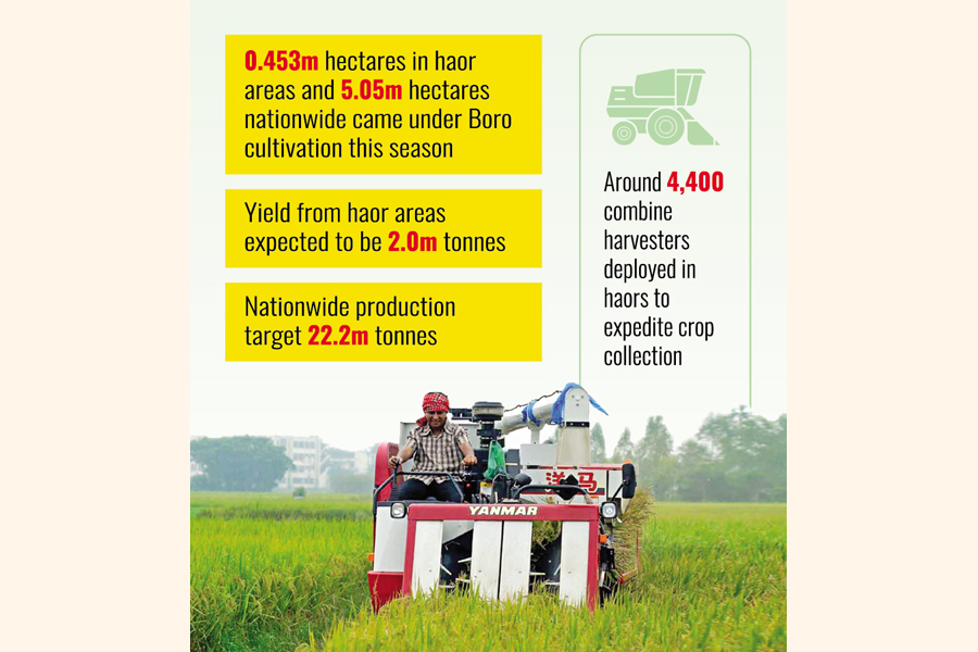 Seven haor districts -- Sylhet, Moulvibazar, Habiganj, Sunamganj, Kishoreganj, Netrokona and Brahmanbaria -- cultivated a total of 453,000 hectares of Boro paddy this year. Some 438,000 hectares have been harvested till May 4.