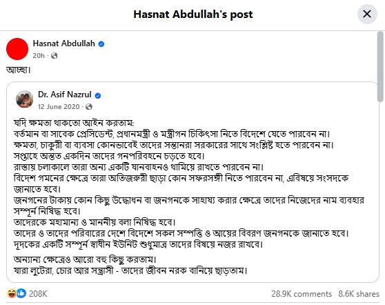 The original post, published by Nazrul on Jul 12, 2020, highlighted irregularities among government officials, including seeking medical treatment abroad, and suggested tough restrictions. He wrote, “I would make a law if I had the power.”