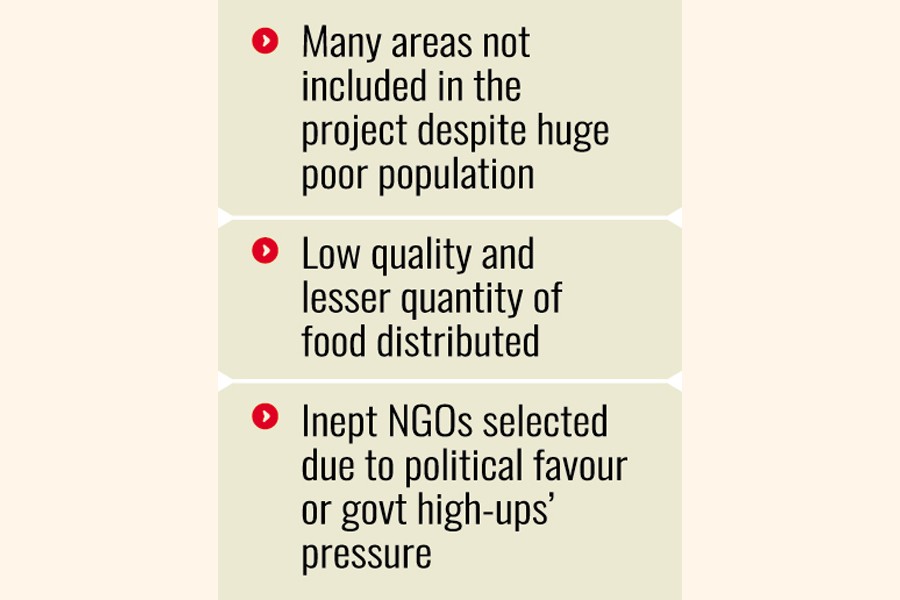Despite significant proportion of poverty-stricken population, many areas were not incorporated in the project. Many incompetent NGOs, responsible for food supply under it, were selected following political consideration or under pressure from the government high-ups, an impact evaluation report of the IMED said.