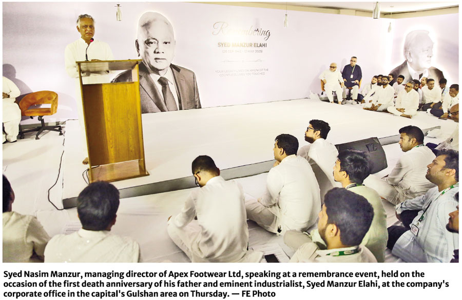 Officials and employees of Apex Footwear Ltd on Thursday remembered their late founding chairman Syed Manzur Elahi by paying rich tributes to his memory, recalling his honesty, visionary leadership, and deep sense of social responsibility at a memorial event held at the company's corporate office in the capital's Gulshan.