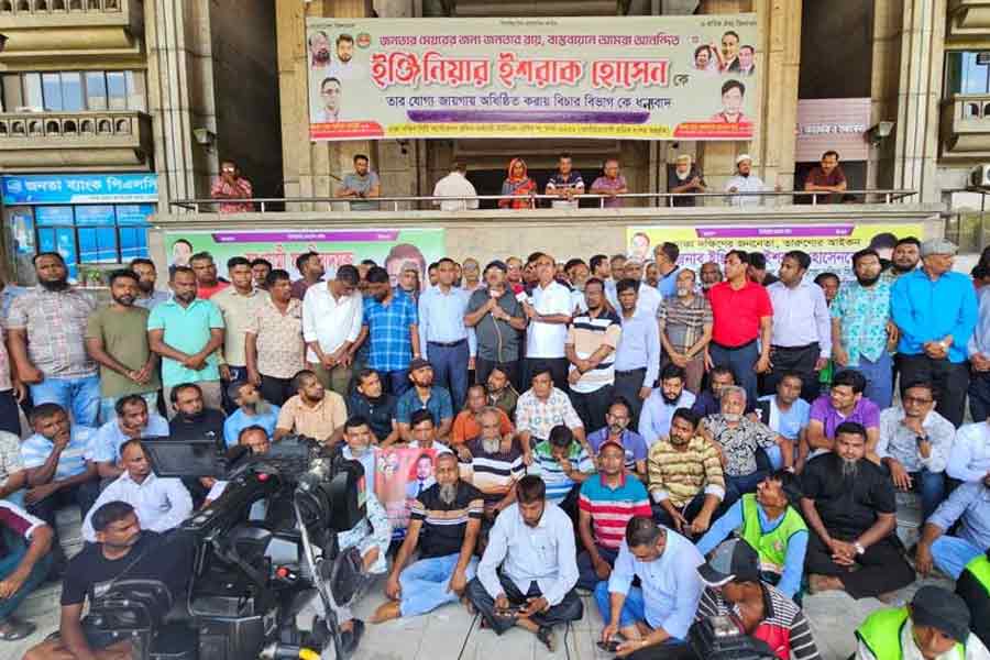 Joining city staff in the protest was former secretary Moshiur Rahman, now coordinator of Ishraque’s supporters’ platform “Dhaka Bashi”.