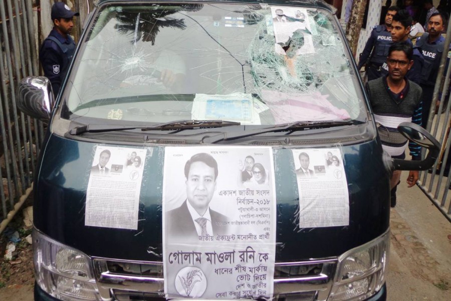 In Patuakhali, the vehicle carrying the family members of BNP candidate in Patuakhali-3 Golam Maula Rony, including his wife Runu Begum and sister, was attacked in Madina Masjid area of Golachipa upazila at afternoon.