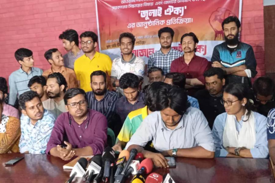 ‘July Unity’, a pressure group claiming to stand for the values of the July 36 Uprising, held a press conference on Sunday at TSC of Dhaka University responding to the government’s decision regarding the ban on the Awami League and the July Declaration, as well as to address the coalition’s next steps.