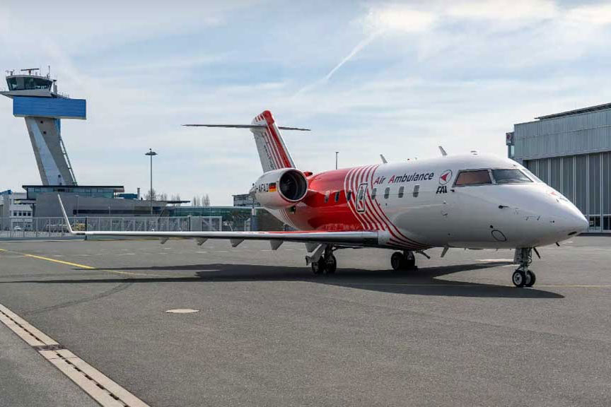 The jet is a twin-engine Bombardier Challenger (CL-60) model, configured fully as an air ambulance.