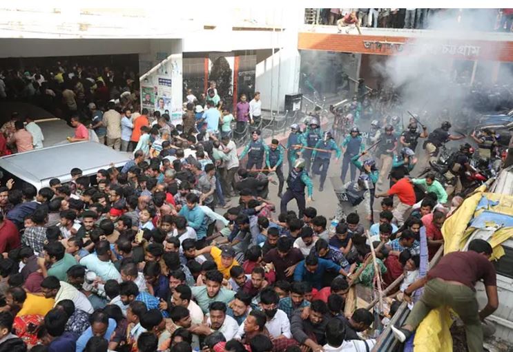 Earlier in the day, thousands of people from the Hindu community gathered around the prison van carrying Chinmoy Krishna Das Brahmachari, a spokesperson for the Bangladesh Sanatan Jagaran Mancha, to stage protests after a court issued an order to send him to jail.