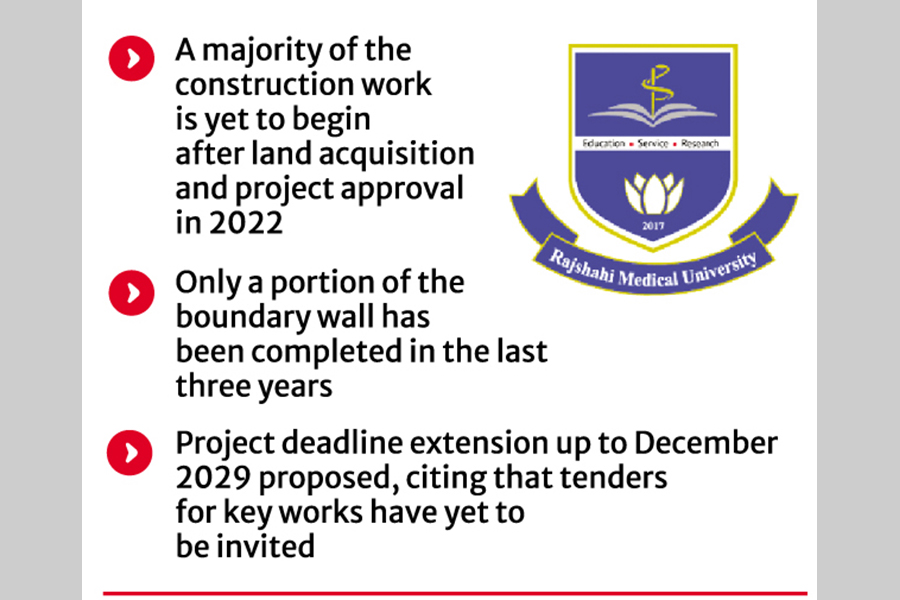 Rajshahi Medical University (RMU) has made little progress on its Tk22.58 billion development project, with only a portion of the boundary wall completed in the last three years since land acquisition and project approval in July 2022, leaving a majority of the construction work yet to begin.
