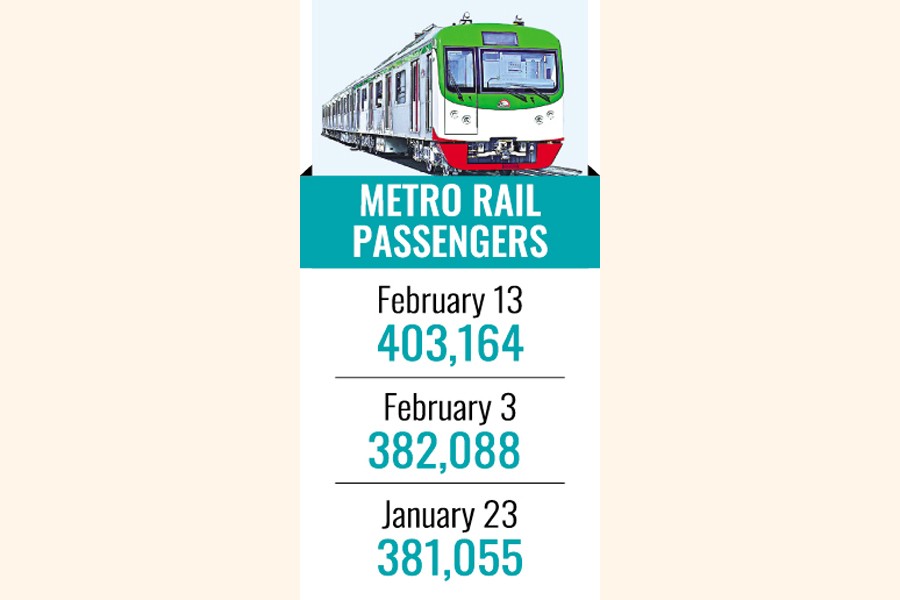 According to Dhaka Mass Transit Company Limited (DMTCL), a record 403,164 passengers used the metro rail February 13 breaking its previous record of 382,088 on February 3. Earlier, the highest daily ridership was 381,055 on January 23, while the metro rail carries 350,000 passengers on average every day.