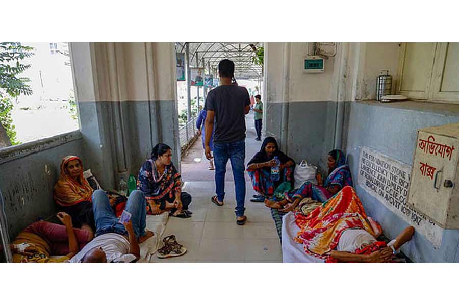 Hundreds of patients have been admitted to Sir Salimullah Medical College Mitford Hospital with fever. Many have set up makeshift beds near stairways and balconies due to the scarcity of hospital beds.