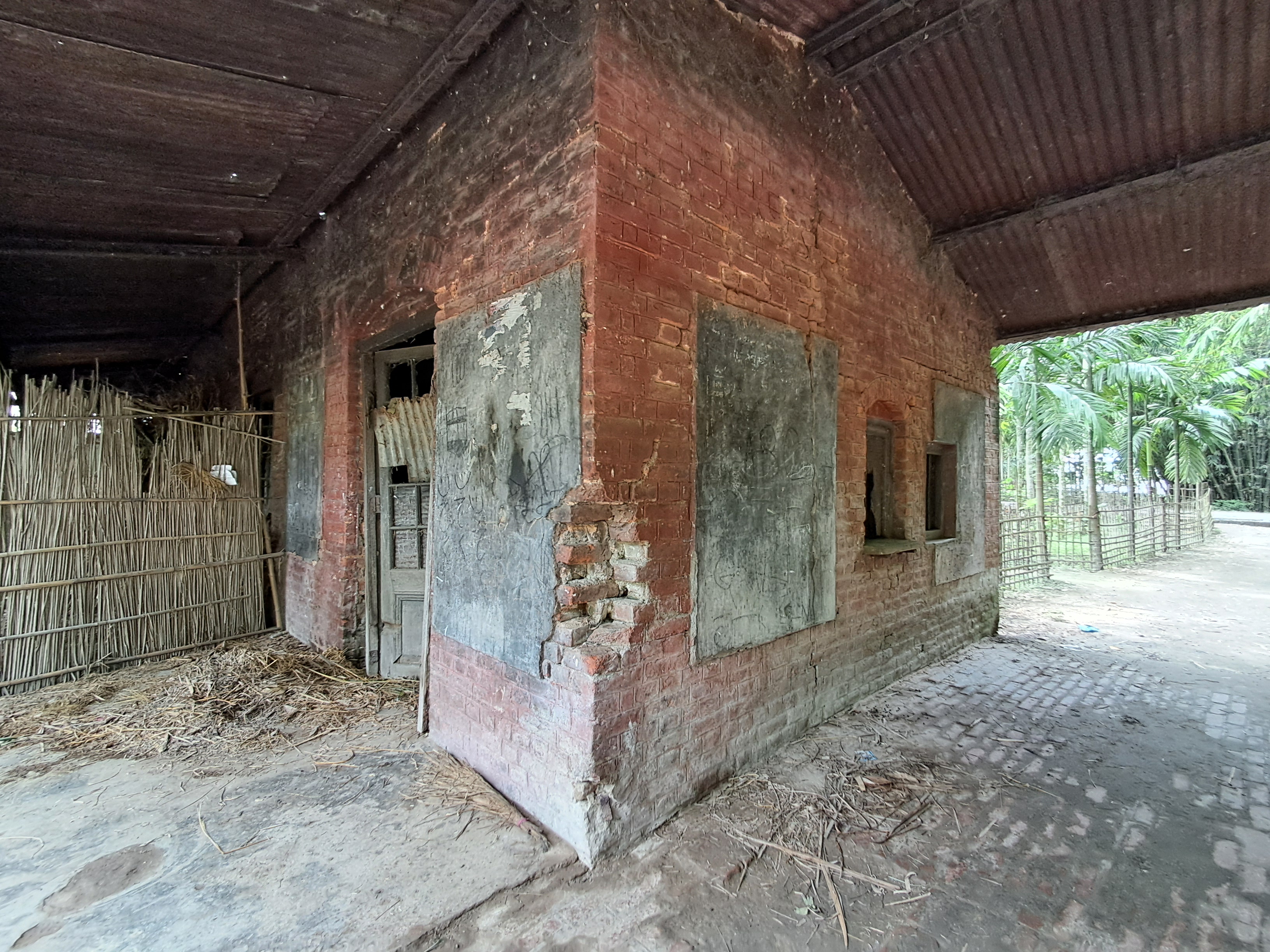 All that is left of the Mogolhat station is a ramshackle, single-storey structure with crumbling red walls and a rusty tin roof with large holes. Fitted in a displaced doorframe, the glazed double door is padlocked, some of its panes missing and others thick with grime. A haphazard mass of hay in the doorway makes it look like a cowshed.