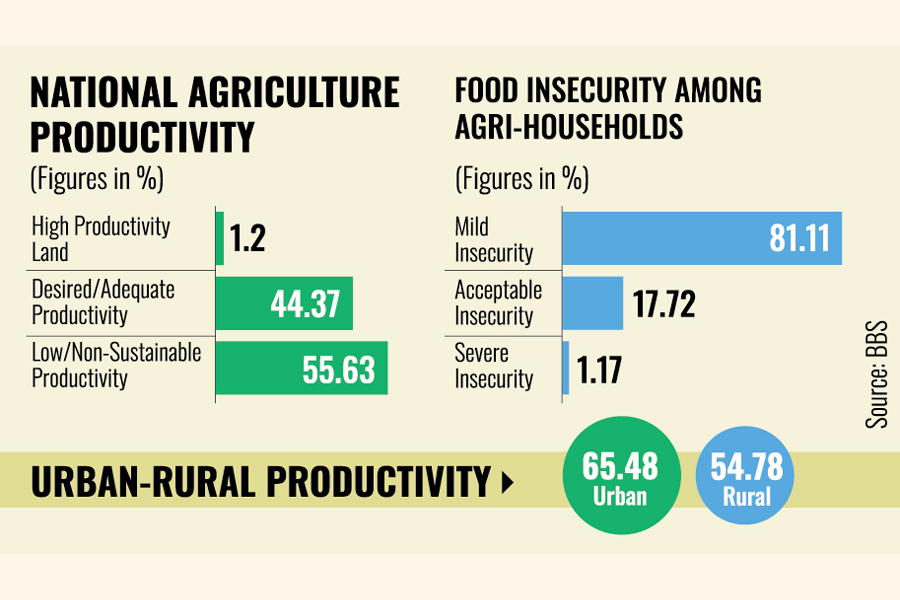 On the food-security scale, the BBS shows an overwhelming 81.11 per cent of agro-households have mild food insecurity, 17.72-percent HHs have "acceptable food insecurity" and 1.17-percent HHs are in severe food insecurity.
